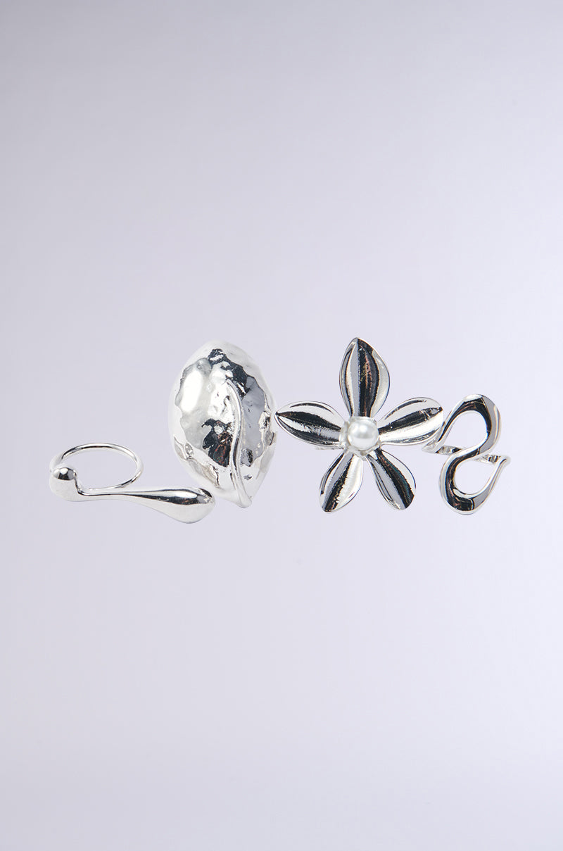The AKIRA Label All The Power Ring Set includes three bold rings crafted from sleek faux silver. The trio consists of a large flower ring with a faux pearl center. an S-shaped squiggle ring. and an abstractly-shaped. horizontal design that stretches across two fingers.